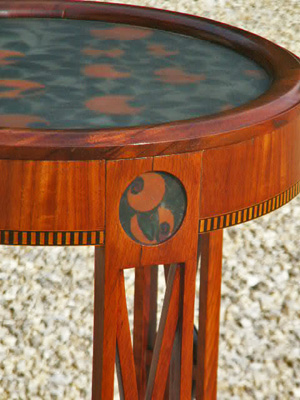 anciennes sont essentielles. Je n'utilise que des colles animales (surtout un mélange de colle d'os et de nerf) pour tous les assemblages, ce qui garantit une réversibilité totale. La finition est parfois cirée, souvent vernie. J'emploie exclusivement du vernis gomme laque, appliqué soit au tampon, soit à la mèche. |