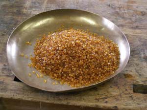 J'utilise surtout un mélange de colle d'os et de nerf, appellé aussi colle forte. J'achète ces colles sous forme de perles deshydratées et le mélange se fait à sec, à raison de 3 parties de colle d'os pour 1 partie de colle de nerfs. | Colle d'os en perles | |||