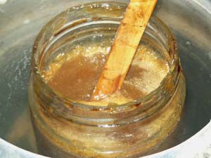Une fois l'ensemble mélangé à sec, on le recouvre d'eau froide afin de permettre à la colle de gonfler pendant environ 15 heures. Ensuite, on chauffe la colle au bain marie sans jamais faire bouillir. La première cuisson se fait sur plusieurs jours, durant lesquels il faut régulièrement remuer la colle et écrémer la mousse qui se forme. |