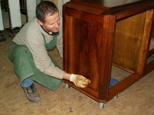 Avant le vernis proprement dit, le support à vernir doit être finement poncé. A ce stade, j'applique une huile (mélange d'huile d'oeillette, de gomme benjoin, d'alcool, de camphre, de racine d'orcanette et de thérébentine), qui me permet de révéler la teinte réelle du bois et de préparer le support pour la phase suivante : le remplissage des pores à la poudre ponce. Ce remplissage se fait également à l'aide d'un tampon, qui ne servira qu'au remplissage. Après environ 1 nuit de "tirage" de l'huile, je commence le remplissage : je saupoudre la surface à vernir de poudre ponce très fine, j'humidifie la tampon de remplissage à l'alcool et je "tourne" en appuyant assez fortement (c'est une des étapes les plus physiques du vernis tampon !). Il faut régulièrement laisser "tirer" (sécher) la ponce. Selon l'essence de bois utilisée, cette étape se fera sur plusieurs jours. Une fois tous les pores du bois remplis, on peut commencer le vernis. Pour cela, on verse le vernis sur le tampon de laine et on referme la toile de coton sur le tampon en veillant à ne pas faire de plis. Et on commence à tourner en décrivant des cercles et des "huit" réguliers, sans déposer trop de vernis à la fois. Ici également, le respect de temps de séchage et "tirage" est très important. La réalisation d'un bon vernis au tampon nécessite une bonne quinzaine de jours. On peut alors passer au "travail" (polissage) du vernis pour arriver au "grand brillant". Pour le novice, ces étapes peuvent paraître longues. Les belles choses ont un prix et nécessitent du temps, mais le résultat obtenu en vaut réellement la peine. |